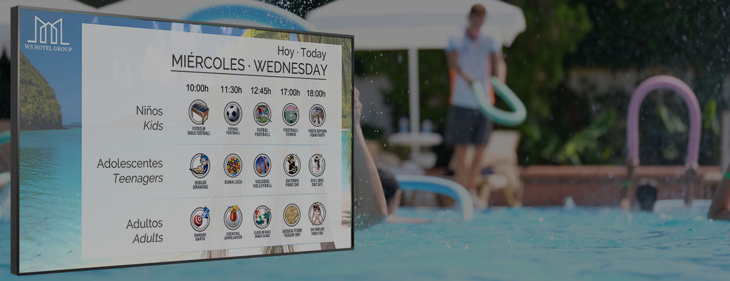 Descubre nuestro módulo de actividades: cuadros digitales totalmente personalizados para vuestro hotel, con programación específica para niños, adolescentes y adultos. Muestra las actividades del día o presenta una vista semanal, según tus necesidades. Elige el formato que mejor se adapte a tu espacio y comunica cada actividad con fichas visuales, integradas con la imagen corporativa del hotel.